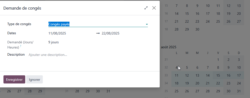 Le type de congé s'affichera par défaut, mais vous pouvez le changer en fonction d'une prise de récupération si besoin.